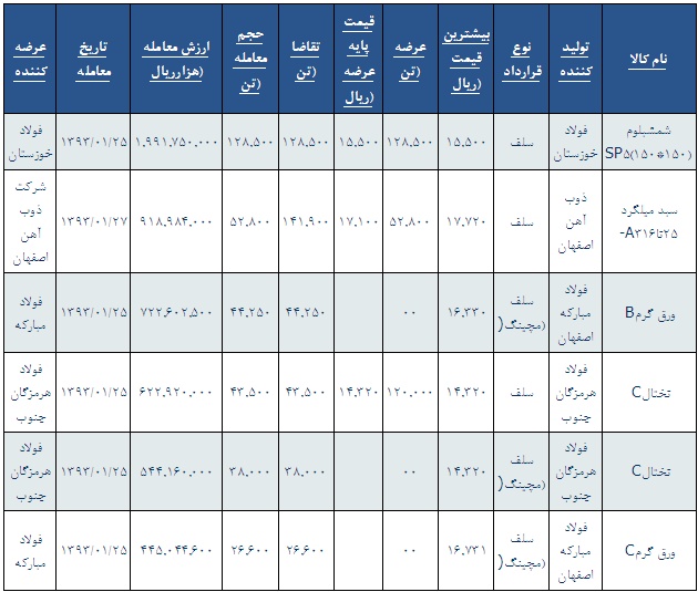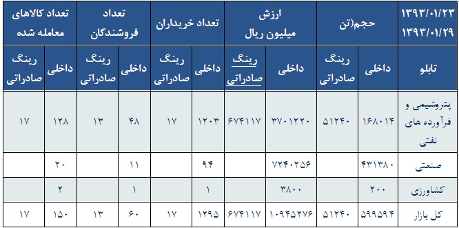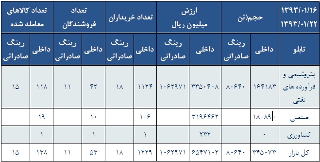 به گزارش بورس نیوز، درمعاملات هفته مذکور بورس کالا شاهد ثبت اولین معامله شکر در سال 93 بودیم همچنین در روز ابتدایی نیز انواع قیر و محصولات پلیمری و شیمیایی نیز عرضه شد که در اواسط هفته نیز عرضه هایی را در این بخش شاهد بودیم. در مجموع عمده معاملات در این هفته حول محصولات صنعتی صورت پذیرفت و پس از آن محصولات پتروشیمی قرار گرفت. همانطور که انتظار می رفت وضعیت نسبت به هفته ماقبل بهبود ملموسی داشت.