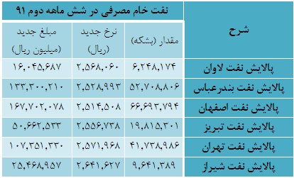 با عنایت به اطلاعات موجود در گزارش های سال 91 ، قیمت خرید نفت خام توسط شرکت های پالایشی با نرخ ارز مرجع 1226 تومان تسعیر شده ، بنابراین قیمت جهانی این ماده مصرفی در دوره شش ماهه دوم سال 91 به شرح ذیل بوده است:
