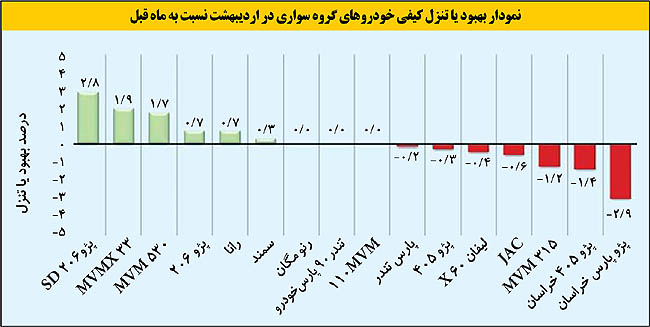 براي مثال خودروي ام.وي.ام 110 كه در بررسي فروردين ماه رده آخر جدول كيفيت را به خود اختصاص داده بود، اين ماه نيز با 85 نمره منفي در رده آخر خودروهاي گروه قیمتي يك قرار گرفت و خودروي ام.وي.ام ايكس 33 نيز با اينكه در گروه خودروهاي 60 تا 100 ميليوني قرار دارد، با 65 امتياز منفي در رده آخر اين گروه قرار دارد.