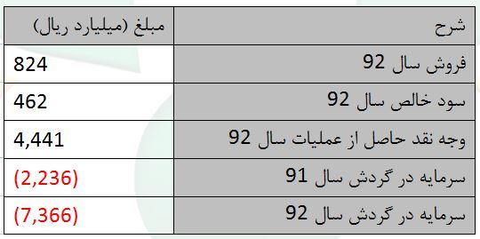 حال سوال اینجاست که فروش شرکت مجموعا 82 میلیارد تومان بوده و سرمایه در گردش شرکت هم حدود 500 میلیارد تومان در سال 92 کمتر شده است و از یک رقم منفی 223 میلیارد تومانی به رقم منفی 736 میلیارد تومان رسیده است! پس چگونه است که در صورت جریان وجوه نقد، در بخش فعالیت های عملیاتی رقم عجیب 444 میلیارد تومانی ورود وجه نقد را می بینیم؟