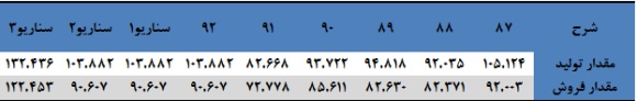 مقدار تولید و فروش در سناریو 1 و 2 معادل مقدار سال 1392 و مقدار تولید و فروش در سناریو3 دوبرابر 6ماه اول سال1393 می باشد.