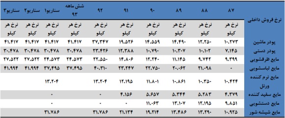 *55 درصد از نظر مقدار فروش داخلی و 20 درصد از مقدار فروش صادراتی در دوره 6ماهه 93 مربوط به مایع ظرفشویی می باشد که در صورت افزایش نرخ مایعات تاثیر زیادی بر سودآوری شرکت دارد.