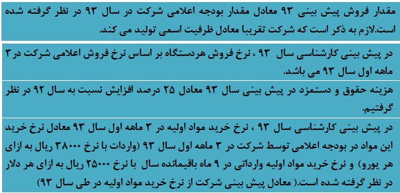 *در بودجه اعلامی سال 93 پیش بینی شده است که 27 درصد از مواد اولیه از خارج از کشور و با نرخ 24,867 ریال به ازای هر دلار تامین گردد.این در حالی است که شرکت اعلام کرده است که در 3 ماهه اول سال 93 , مواد اولیه وارداتی خود را با نرخ 38000 ریال به ازای هر یورو خریداری کرده است.