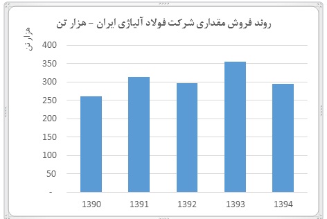 روند فروش محصولات شرکت همانگونه که در شکل زیر مشاهده می شود روندی صعودی داشته است. کاهش مقداری فروش در سال 94 بدلیل کاهش قیمت جهانی و رکود بازار داخلی بوده است که حجم فروش شرکت در سال 94 را تحت تاثیر قرار داده است.