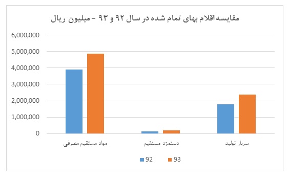 بهای تمام شده محصولات شرکت در سه بخش مواد، دستمزد و سربار قابل بررسی است. در ترکیب بهای تمام شده، از آنجایی که مواد مستقیم مصرفی با بیش از 60% بهای تمام شده، مهم ترین بخش هزینه ای را به اختصاص داده است. به توجه به اهمیت مواد مستقیم این بخش مورد بررسی قرار می گیرد. 32 درصد از بهای تمام شده مربوط به سربار بوده است و تنها 3 تا 5 درصد مربوط به دستمزد مستقیم تولید است.