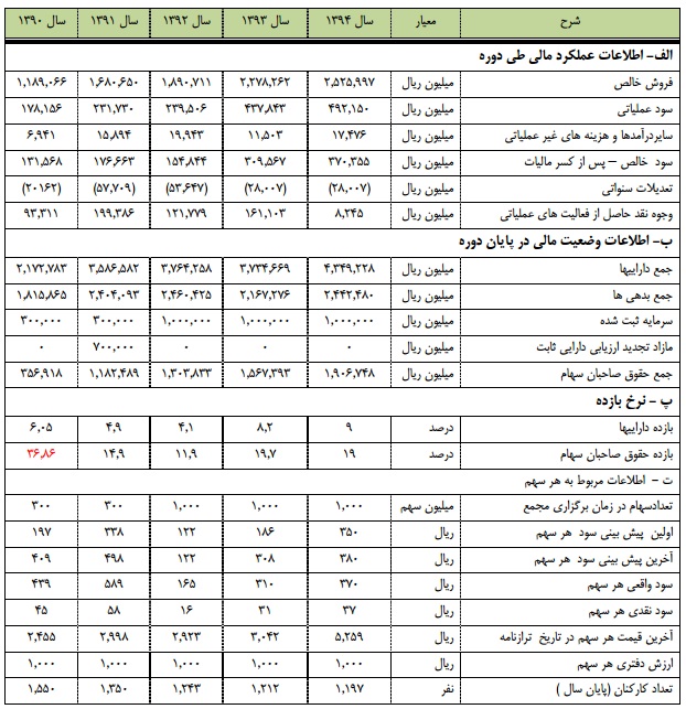 خداوند منان را شاكر و سپاس گذاریم كه اين توفيق را به ما عطا نمود تا یکبار ديگر در لباس خدمت به شما سهامداران گرامي بتوانيم مجمع عمومي صاحبان سهام سال1394 را برگزار نماييم. بیشک حمایتها و اعتماد هميشگي شما سهامداران گرامي در اين دوره باعث شده كه منتخبان شما در هیئتمدیره شركت بتوانند با اتخاذ تصميمات خود، همهی تلاش خود را جهت جلب رضايت حداكثر سهامداران نمايند.