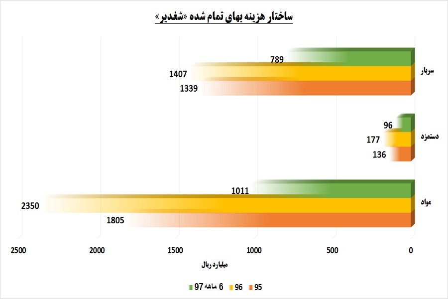 اغلب بهای تمام شده «شغدیر» در مواد مستقیم مصرفی جمع شده و سربار نیز پا به پای مواد مصرفی پیش می آید. عمده عوامل بهای تمام شده شرکت، هزینه خوراک است.