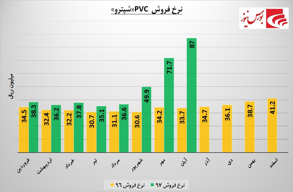 البته کاهش مقدار تولید، با رشد نرخ فروش جبران شده و نه تنها از افت درآمدها جلوگیری کرده، بلکه موجبات افزایش را نیز فراهم آورده است. نرخ فروش در تمام ماه های سال جاری بیش از مدت مشابه سال قبل بود. در حالی که «شپترو» در ابتدای سال PVC را با نرخ 38.3 میلیون ريال به فروش رسانده، در آبان ماه با رشدی قابل توجه به 87 میلیون ريال رسیده است.
