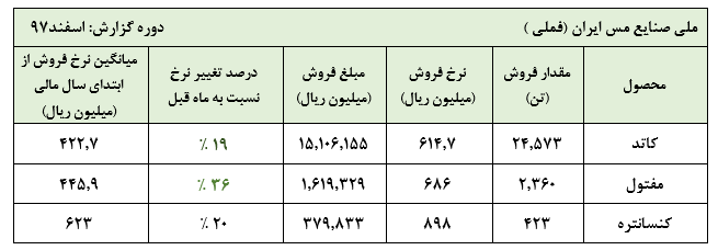 همانگونه که در جدول فوق نیز ملاحظه میشود افزایش نرخهای فروش در محصولات اصلی شرکت به ویژه کاتد و مفتول در اسفند ماه در مقایسه با نرخهای بهمن ماه و همچنین فروش 24.573 تنی کاتد و 2.360 تنی مفتول از مهمترین دلایل عملکرد ویژه این شرکت در این ماه است.