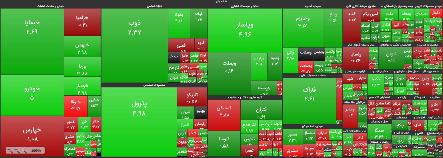 امروز حجم بازار بیشتر در گروههای خودرویی، فلزات اساسی، شیمیاییها، بانکها و انبوهسازیها بود و در برابر میزان ارزش بازار، پتروشیمی، فلزات، کانیها و فراوردههای نفتی نیز همانند روز گذشته پیشروها بودند.