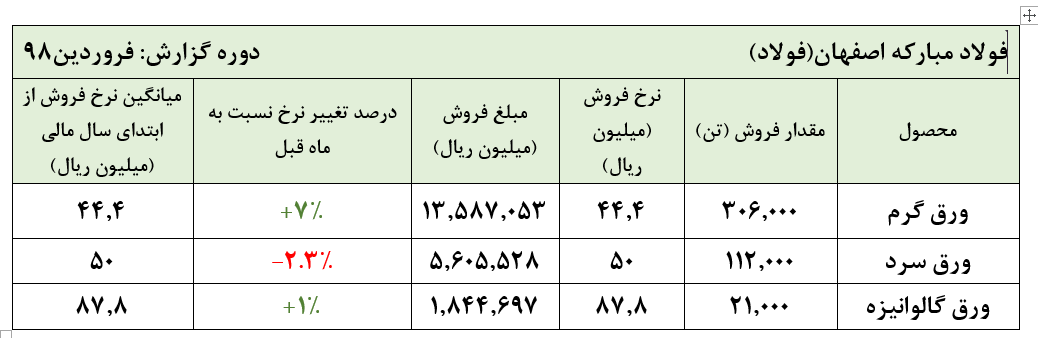 در این ماه شاهد فروش بیش از 300 هزار تن انواع ورق گرم در بازارهای داخلی وصادراتی و با نرخ های افزایشی بودیم. نرخ فروش هر تن از این محصول با 7 درصد رشد نسبت به اسفند ماه همراه بوده است. در محصولات ورق سرد وگالوانیزه شرکت شاهد افت 2.3 درصدی و رشد 1 درصدی نرخ ها بوده ایم.