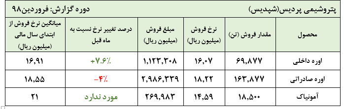 نرخ فروش اوره صادراتی نیز با 4 درصد افت نسبت به ماه قبل، به 18 میلیون و 220 هزار ریال به ازای هر تن رسید.