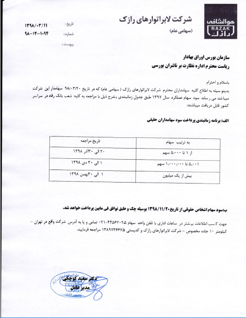شرکت لابراتوارهای رازک (سهامی عام) سود سهام عملکرد سال 1397 را طبق جدول زمانبندی پرداخت خواهد کرد.