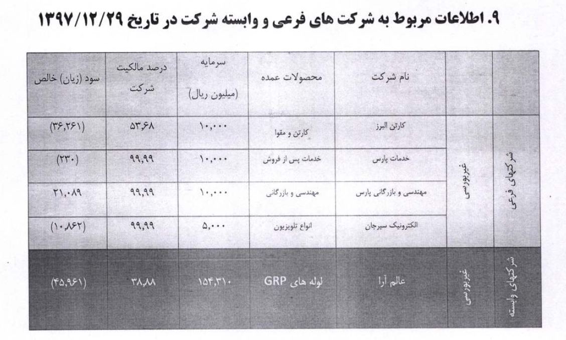 شایان ذکر است که سه شرکت فرعی طي دورههای گذشته، فعاليت عملياتي نداشته و در مجموع، متحل زيان انباشته شدهاند. اوضاع بهقدری وخیم است که شرکت «ساخت و توليد قطعات الکترونيک سيرجان» و «کارتن البرز» به ترتيب 15 و 10 برابر سرمايه ثبت شده، زيان انباشته دارند و شرکت «خدمات پارس» نيز متوقف است.