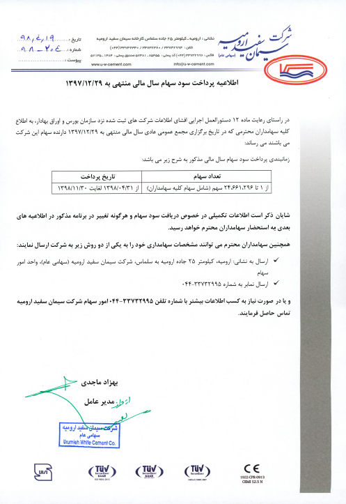 شرکت سیمان سفید ارومیه (سهامی عام) نحوه پرداخت سود به سهامدارانش را اعلام کرد.