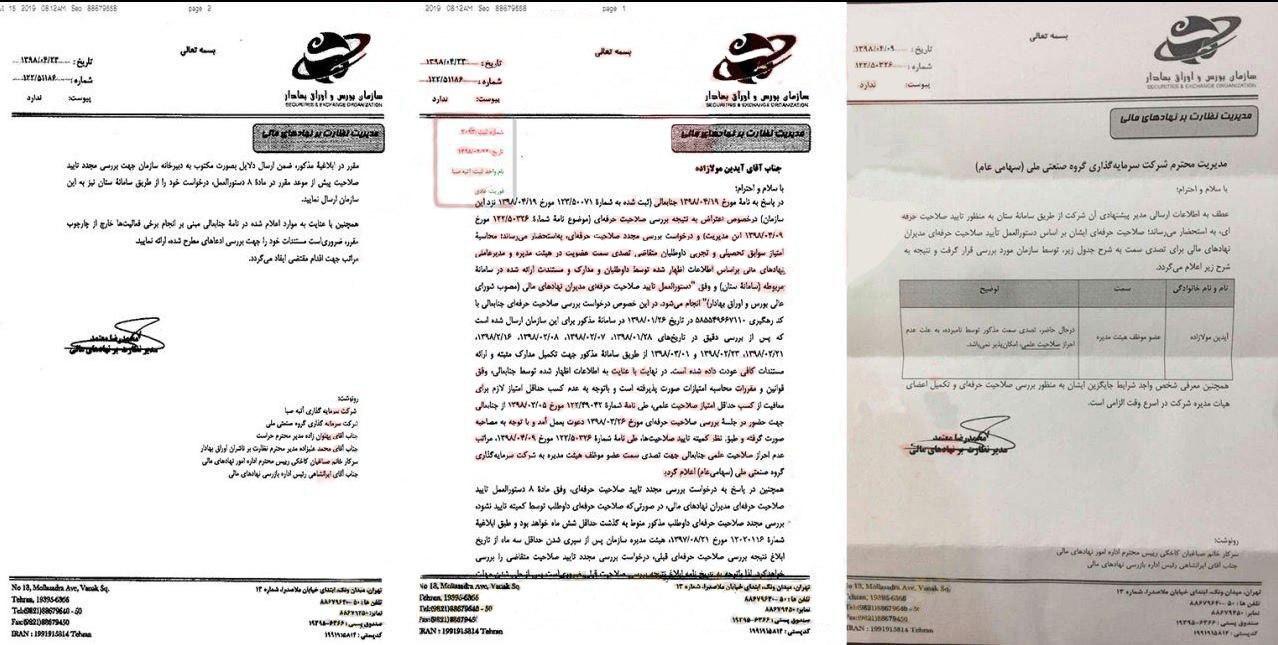 مدیر نظارت بر نهادهای مالی سازمان بورس و اوراق بهادار، این اظهارات را در نامهای خطاب به مدیریت شرکت سرمایهگذاری گروه صنعتی ملی آورده و در انتها هم معرفی شخص واجد شرایط جایگزین نامبرده برای بررسی صلاحیت حرفهای و تکمیل اعضای هیات مدیره شرکت مذکور را در اسرع وقت الزامی دانسته و خواستار رعایت قوانین شده است.