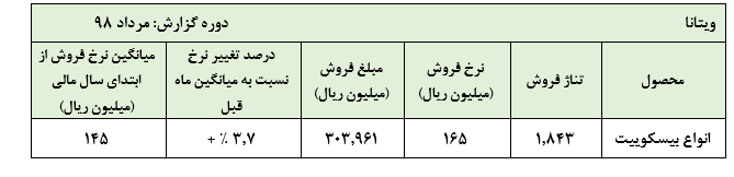 همانگونه که در جدول نیز مشاهده می‌شود، فروش ۱.۲۹۳ تن انواع بیسکوئیت در مرداد ماه منجر به تحقق ۳۰۳.۹۶۱ میلیون ریالی درآمد شده که در مقایسه با ۱.۴۶۴.۱۲۳ میلیون ریال درآمد هفت ماه نخست سال مالی ۱۳۹۸ این شرکت، پوششی مناسب محسوب می‌شود.