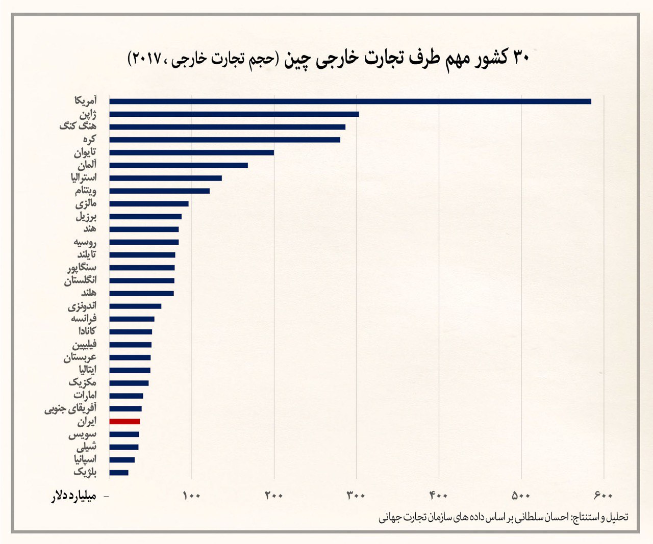 کشورهای عربستان با ۵۰، امارات با ۴۱، عمان با ۱۶، کویت با ۱۲ و قطر با ۷ میلیارد دلار حجم تجارت خارجی با چین، در مجموع از ۴ برابر صادرات و ۳ برابر واردات نسبت به ایران برخوردار هستند.