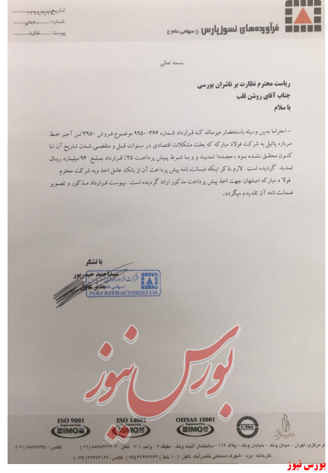 به گزارش بورس نیوز، شرکت فرآوردههای نسوز پارس قرارداد با فولاد مبارکه اصفهان را تمدید کرد.