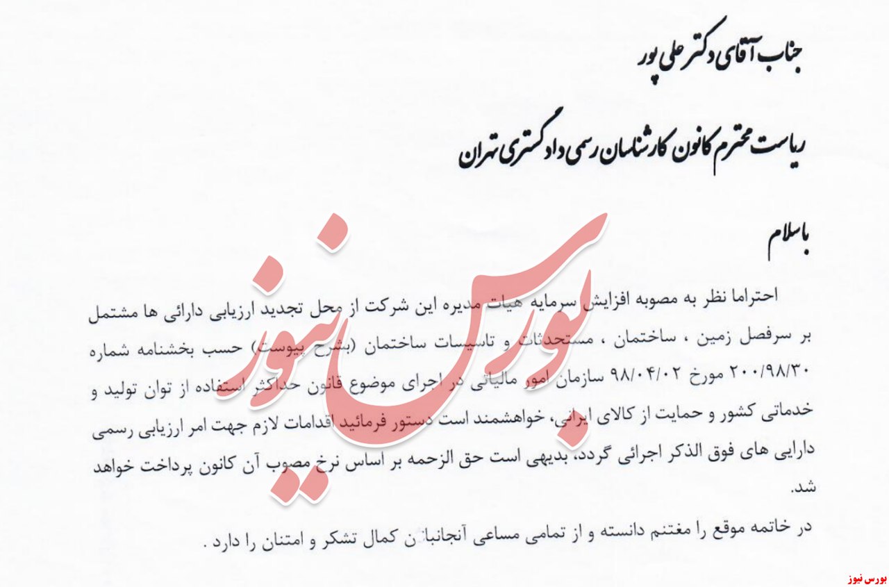 بر این اساس، این شرکت اعلام کرد؛ این نامه به کانون کارشناسان رسمی دادگستری تهران در خصوص تعیین کارشناس بابت ارزیابی رسمی دارایی‌های شرکت، پیرو بخشنامه شماره ۳۰/۹۸/۲۰۰ مورخ ۱۳۹۸/۰۴/۰۲سازمان امور مالیاتی است.
