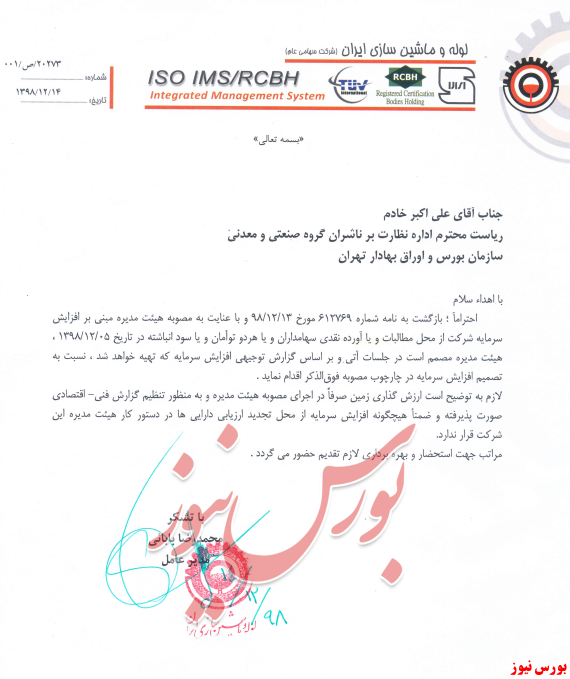 شرکت لوله و ماشین سازی ایران فعلا قصد افزایش سرمایه ندارد.