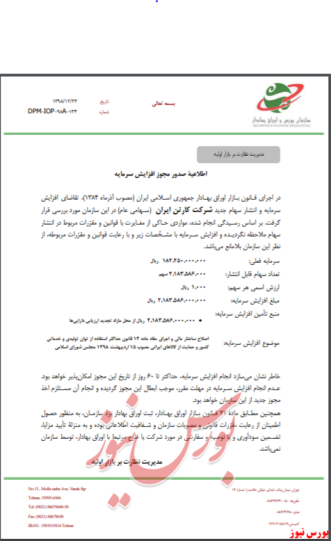 شرکت کارتن ایران قصد دارد سرمایه شرکت را افزایش دهد.