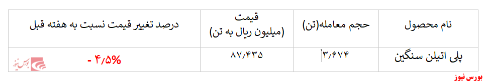 در جدول معاملات هفته گذشته و همچنین نمودار قیمتی هفتگی پلی اتیلن سنگین این شرکت ارائه شده است.