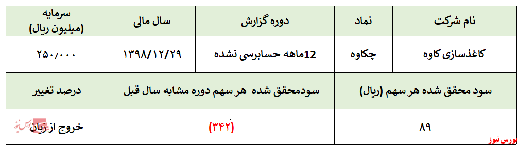 به گزارش واحد تحقیق و مطالعات بورس نیوز، شرکت صنایع کاغذ سازی کاوه در سال مالی منتهی به پایان اسفند ماه ۱۳۹۸ و بر اساس صورت‌های مالی حسابرسی نشده، موفق به کسب سود خالص ۲۲ میلیارد و ۱۸۱ میلیون ریالی شده که این میزان سود در مقایسه با مدت مشابه سال گذشته نشان از خروج شرکت از زیان دهی دارد. این شرکت در سال گذشته زیان خالص ۸۵ میلیارد ریالی را محقق کرده بود.