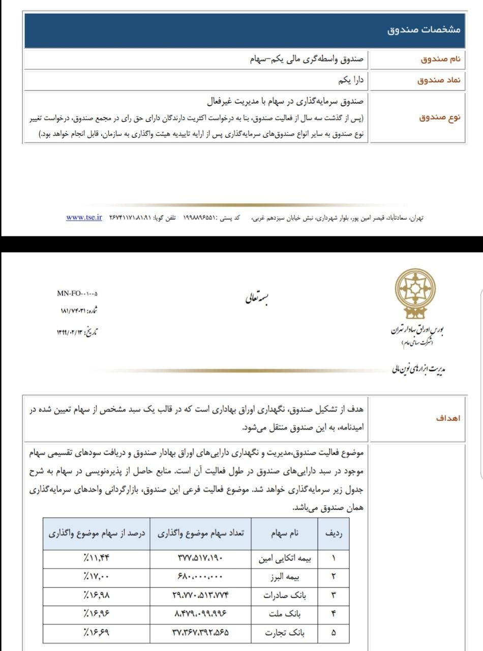 بر اساس این آگهی، ۱۷ درصد از سهام بانک های تجارت، صادرات و ملت؛ بیمه البرز و ۱۱.۴ درصد از سهام بیمه اتکایی امین به این صندوق تخصیص یافته است.