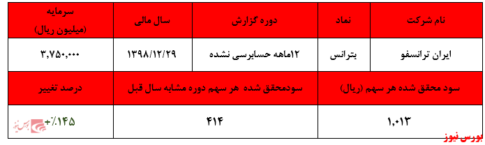 به گزارش واحد تحقیق و مطالعات بورس نیوز، شرکت ایران ترانسفو در سال مالی منتهی به پایان سال ۱۳۹۸ و بر اساس صورتهای مالی حسابرسی نشده سود خالص ۳.۸۰۰ میلیارد ریالی و معادل ۱.۰۱۳ ریال به ازای هر سهم را محقق کرد که این سود در مقایسه با سال قبل از آن رشد جالب توجه ۱۴۴ درصدی را نشان میدهد.