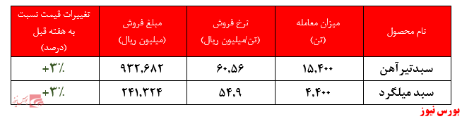 همچنین در این هفته ۴.۴۰۰ تن سبد میلگرد این شرکت عرضه شد. تقاضای در حدود ۱۰ هزار تنی برای این عرضه ثبت گردید. نرخ میانگین موزون معاملاتی این سبد نیز به ۵۴ میلیون و ۸۵۰ هزار ریال به ازای هر تن رسید که نشان دهنده افزایش ۳ درصدی قیمت میلگرد در عرض یک هفته گذشته است.