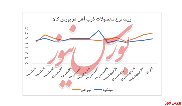 بر اساس نمودار مشخص است که نرخ تیرآهن این شرکت در دو هفته گذشته رو به بالا بوده است و شیب افزایش نرخ میلگرد با روند آهسته تری دنبال شده است.