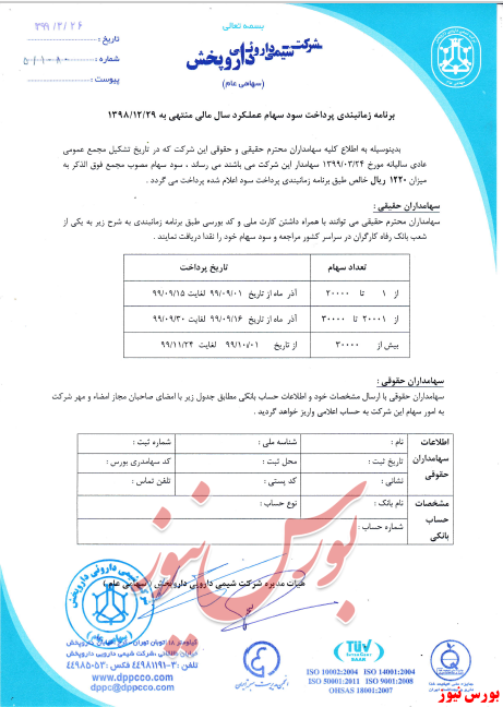 بر اساس این گزارش، این شرکت اعلام کرد، سهامداران حقیقی از تاریخ ۱۳۹۹/۰۹/۰۱ لغایت ۱۳۹۹/۱۱/۲۴ نسبت به دریافت سود اقدام کنند.