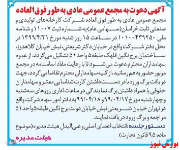 بر این اساس، این شرکت اعلام کرد، از کلیه سهامداران، وکیل یا قائم مقام قانونی صاحب سهم و همچنین نماینده یا نمایندگان اشخاص حقوقی دعوت میگردد تا در جلسه مجمع عمومی این شرکت که در ساعت ۱۵:۰۰ روز شنبه مورخ ۱۳۹۹/۰۴/۲۱ در استان تهران، شهر تهران به آدرس دفتر شرکت واقع در خیابان دکتر شریعتی، نبش خیابان کلاهدوز، ساختمان برج نگین قلهک طبقه پنجم واحد ۵۱ حضور بهم رسانند.