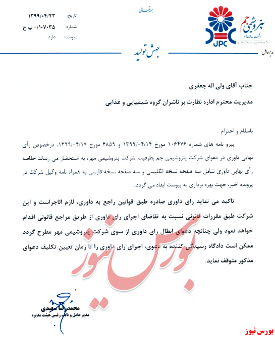 بر این اساس، این شرکت اعلام کرد، درخصوص اختلافات فیمابین با پتروشیمی مهر در رابطه با قرارداد تامین اتیلن، در تاریخ ۱۳۹۹/۰۴/۱۱ هیات داوری رای داوری بر محکومیت شرکت پتروشیمی مهر به پرداخت مبلغ ۸۷۲.۳۵۴.۶۵۶ دلار به شرکت پتروشیمی جم کرد.