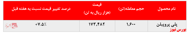قیمت میانگین هر تن پلی پروپیلن در هفته گذشته با رشد ۱.۷ درصدی نسبت به هفته منتهی به ۱۹ تیر ماه به ۱۶۹.۹۳۲ هزار ریال در هر تن و ارزش معاملات این محصول در هفته گذشته به ۵۵۷ میلیارد و ۳۹ میلیون ریال رسید.