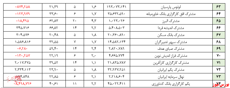 • صندوق کمند و کاردان با ۲۰.۳۳۰ و ۱۵.۸۷۳ میلیارد ریال جذب منابع مالی بهترین عملکرد را از این حیث داشته اند. صندوقهای یکم کشاورزی و کوثر یکم نیز با خروج ۸.۵۰۰ و ۷.۳۵۰ میلیارد ریال خروج منابع مالی، بدترین عملکرد را از این حیث داشته اند.