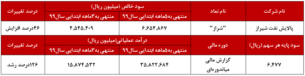 شرکت پالایش نفت شیراز "شراز" در گزارش مالی میاندورهای ۵ ماهه منتهی به ۹۹.۰۵.۳۱، میزان سود خالص شرکت خود را مبلغی بالغ بر ۶ هزار و ۶۵۴ میلیارد و ۸۶۷ میلیون ریال به ثبت رسانده و همچنین درآمدهای عملیاتی این شرکت در این دوره به مبلغ ۳۵ هزار و ۸۲۲ میلیارد و ۶۸۴ میلیون ریال گزارش شده و سود پایه هر سهم از ابتدای سال تا مرداد ماه به ۶۴۷۷ ریال رسیده است.