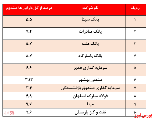 همچنین در جدول زیر شرکتهای اصلی تحت سرمایه گذاری این صندوق که اطلاعات آن از آخرین صورت وضعیت پرتفوی افشا شده این صندوق استخراج شده، ارائه شده است.