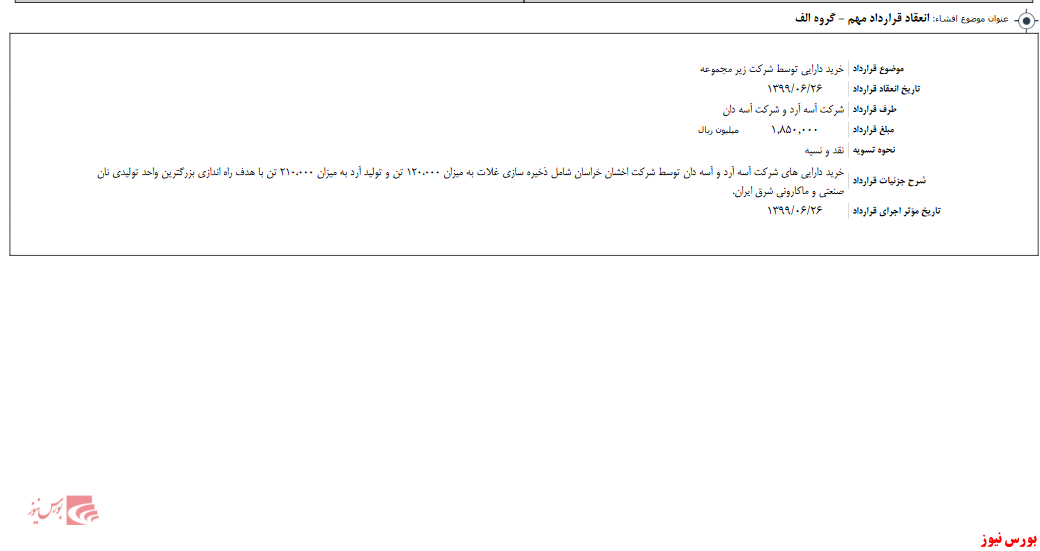 بر اساس این گزارش، این شرکت اعلام کرد، خرید داراییهای شرکت آسه آرد و آسه دان توسط شرکت اخشان خراسان شامل ذخیره سازی غلات به میزان ۱۲۰.۰۰۰ تن و تولید آرد به میزان ۲۱۰.۰۰۰ تن با هدف راه اندازی بزرگترین واحد تولیدی نان صنعتی و ماکارونی شرق ایران صورت گرفته است.