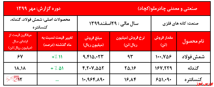 پس از ثبت فروشی بیش از ۱۴.۴۱۷ میلیارد ریالی انواع محصولات تولیدی توسط شرکت چادرملو در شهریور ماه سال ۱۳۹۹، عملکرد مهرماه این شرکت نشان از افزایش محسوس نرخهای فروش گندله، فولاد و کنستانتره تولیدی این شرکت دارد.