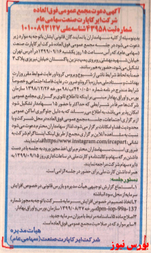 بر این اساس، این شرکت اعلام کرد، از کلیه سهامداران، وکیل یا قائم مقام قانونی صاحب سهم و همچنین نماینده یا نمایندگان اشخاص حقوقی دعوت میشود تا در جلسه مجمع عمومی این شرکت که در ساعت ۱۵:۰۰ روز یکشنبه مورخ ۱۳۹۹/۰۹/۱۶ در استان تهران، شهر تهران به آدرس تهران-خیابان شهید بهشتی-رو به روی پمپ بنزین پاکستان-خیابان نیریزی پلاک ۳ حضور بهم رسانند.