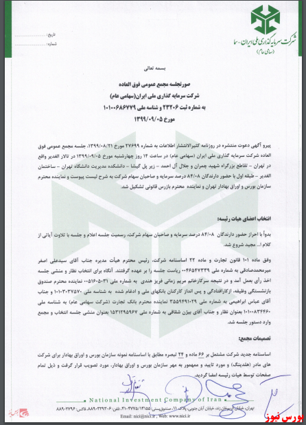 بر این اساس، این شرکت اعلام کرد، شرکت سرمایه گذاری ملی ایران (سهامی عام) به شرکت هلدینگ چند رشته طی جلسه مورخ ۱۳۹۹/۰۸/۲۸ هیئت پدیرش شرکت بورس اوراق بهادار و مصوبه مجمع عمومی قوق العاده مورخ ۱۳۹۹/۰۹/۰۵ تغییر یافت.