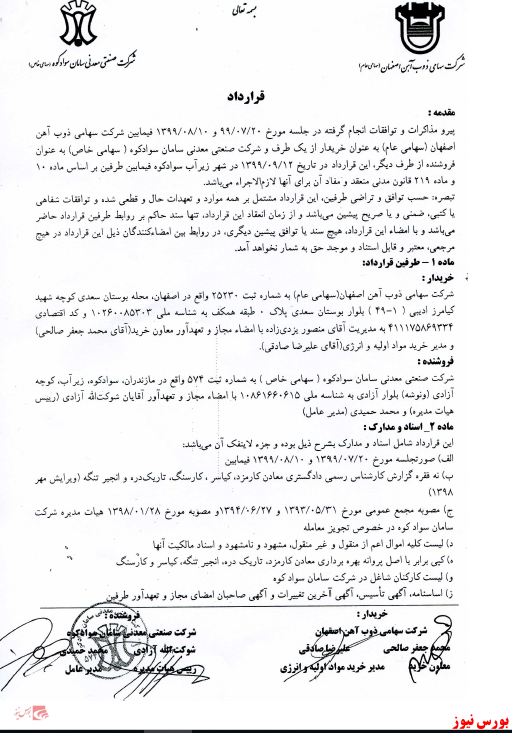 بر این اساس، این شرکت اعلام کرد، قرارداد واگذاری و انتقال پروانه بهره برداری کلیه معادن، انتقال امتیاز زیر ساختها و خرید کلیه اموال و داراییهای شرکت صنعتی معدنی سامان سوادکوه منعقد شده است.