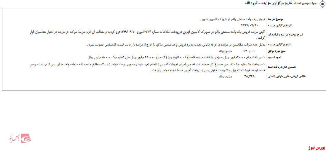 بر این اساس، این شرکت اعلام کرد، مزایده فروش یک واحد صنعتی واقع در شهرک کاسپین قزوین به دلیل عدم شرکت متقاضیان در مزایده در فرجه قانونی، هیئت مدیره فروش واحد صنعتی مذکور را خارج از مزایده با رعایت قیمت کارشناسی تصویب کرد.