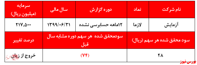 به گزارش گروه تحقیق و مطالعات بورس نیوز، شرکت آزمایش در سال مالی منتهی به پایان شهریورماه سال جاری و بر اساس صورتهای مالی حسابرسی نشده، سود خالص ۶ میلیارد و ۱۲۳ میلیون ریالی را محقق کرده است.