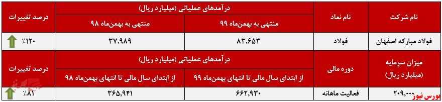 بر پایه این گزارش، درآمدهای حاصلشده فولاد مبارکه اصفهان در بهمنماه سال جاری نسبت به دوره مشابه سال گذشته افزایش ۱۲۰ درصدی را توانسته از خود بر جای بگذارد، همچنین از ابتدای سال مالی تا انتهای بهمنماه نیز مجموع درآمدهای این شرکت فولادی ۸۱ درصد رشد درآمد را تجربه کرده است.