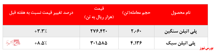 نرخ این محصول با رشد ۸.۵ درصدی در مقایسه با هفته منتهی به ۱۴ اسفندماه به ۳۰۱.۵۸۵ هزار ریال در هر تن رسید و ارزش معاملات آن با توجه به رشد نرخ فروش و کاهش ۱.۸۰۴ تنی میزان فروش به یک هزار و ۲۴۷ میلیارد و ۳۵۸ میلیون ریال رسید.