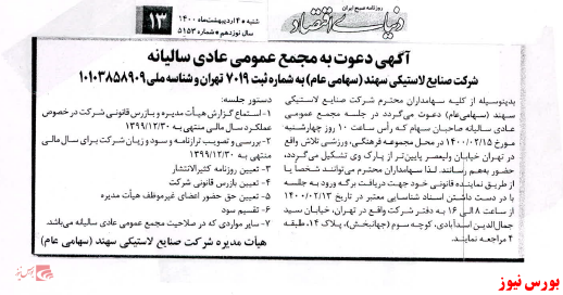 مجمع عمومی عادی سالیانه شرکت صنایع لاستیکی سهند در تاریخ ۱۴۰۰/۰۲/۱۵ برگزار می شود.