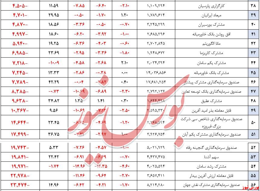ضعیفترین عملکرد را نیز دو صندوق سرو سودمند مدبران و آسمان آرمانی سهام به ترتیب با ۸.۸ و ۵.۸ درصد بازدهی منفی داشتهاند.